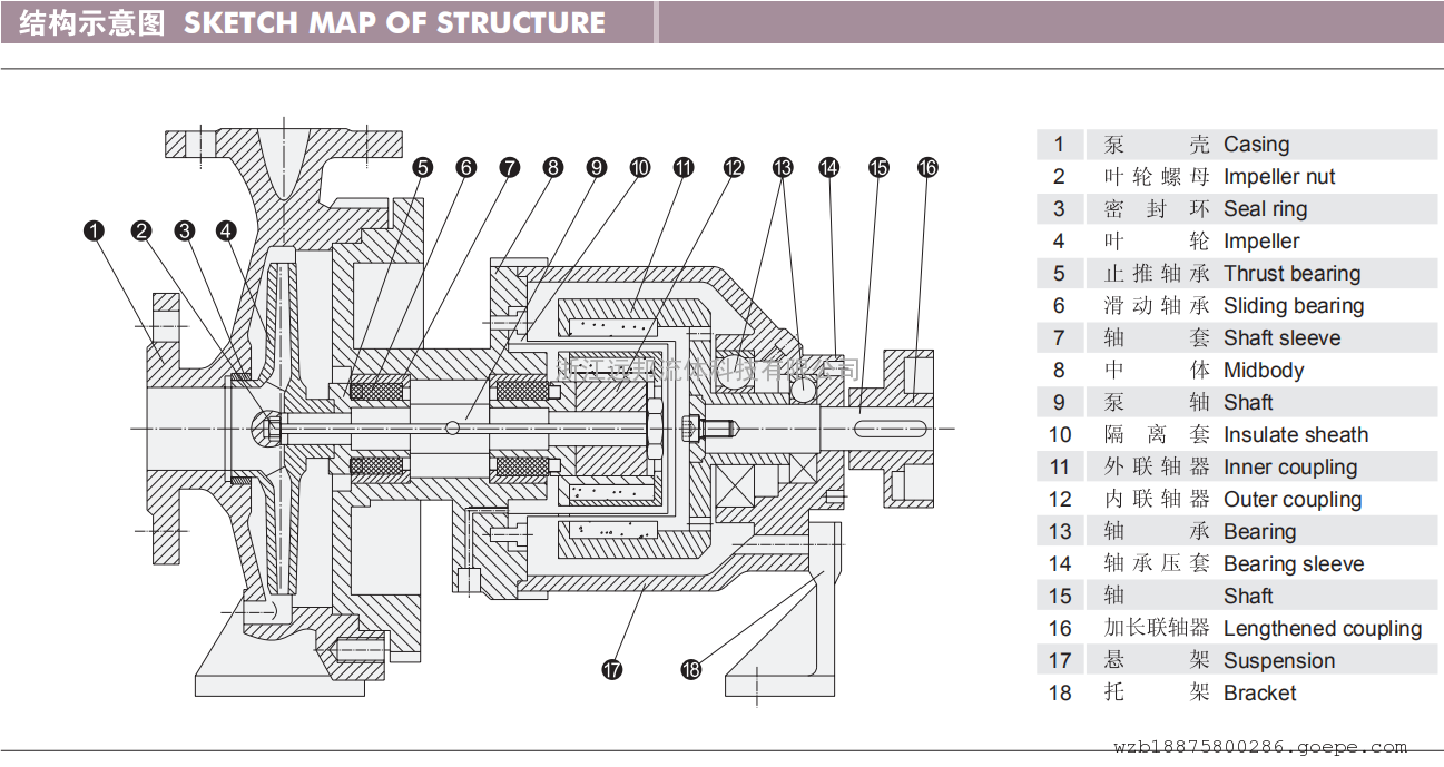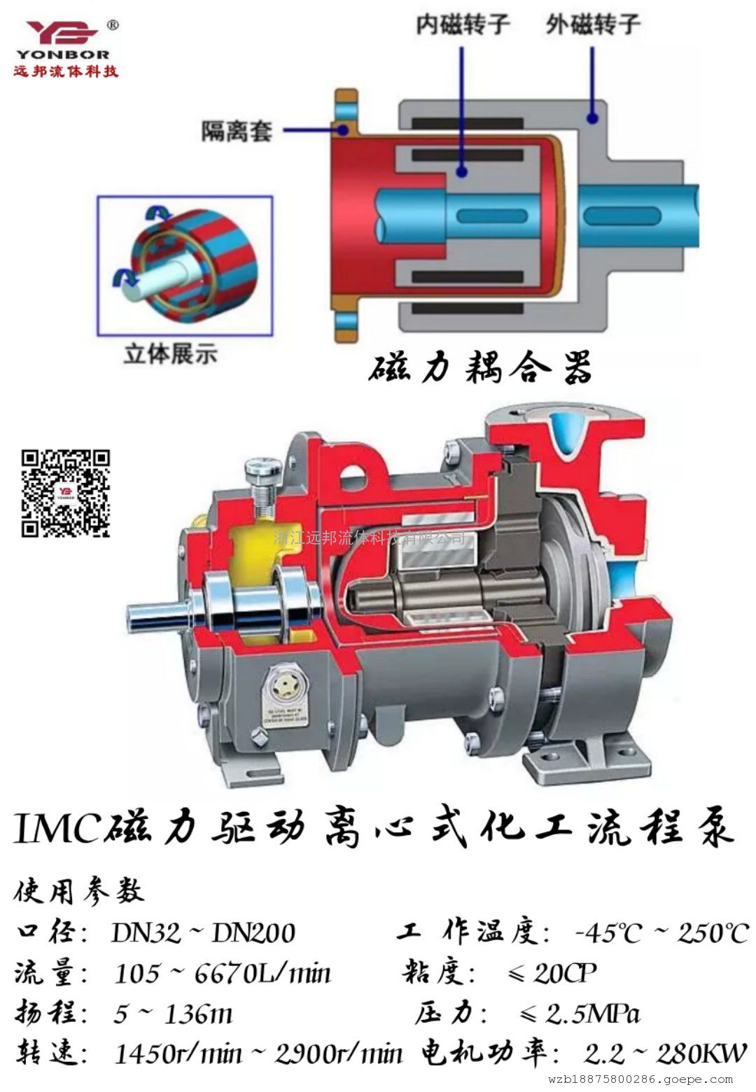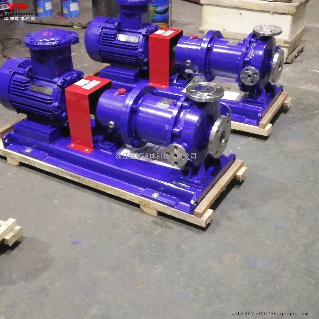 IMC型磁力驱动离心式化工流程泵,此系列泵是卧式悬臂,单级单吸、磁力驱动标准化工流程泵,其传动原理为:电动机与外磁转子(即驱动转子)联在一起组成驱动部件,叶轮和内磁转子通过泵轴联接在一起,组成从动部件,内外磁转子之间设有密封隔离套,将内外磁转子完全隔离开,内磁转子外于介质之间,电动机的转动通过外磁转子的磁极与内磁转子的磁极耦合产生的吸力和斥力组成的推拉合力驱使内磁转子、泵轴和叶轮同步转动。
