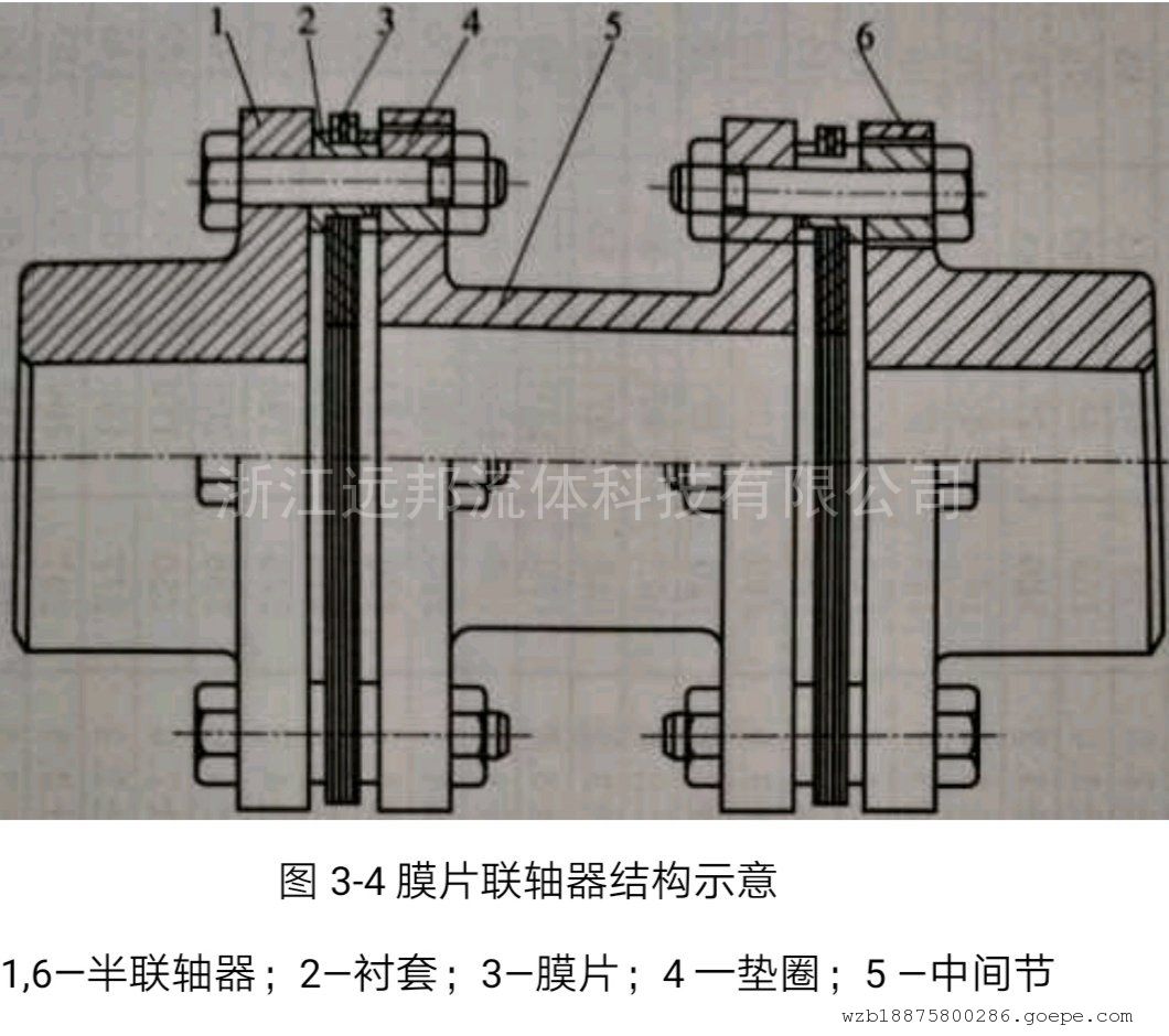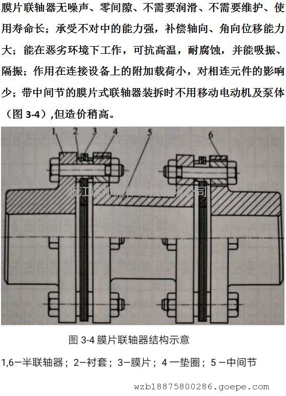 膜片联轴器无噪声、零间隙、不需要润滑、不需要维护、使用寿命长;承受不对中的能力强,补偿轴向、角向位移能力大;能在恶劣环境下工作,可抗高温,耐腐蚀,并能吸振、隔振;作用在连接设备上的附加载荷小,对相连元件的影响少;带中间节的膜片式联轴器装拆时不用移动电动机及泵体(图3-4),但造价稍高。