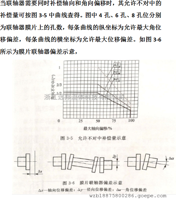 当联轴器需要同时补偿轴向和角向偏移时,其允许不对中的补偿量可按图3-5中曲线査得。图中4孔、6孔、8孔位分别为联轴器膜片上的孔数,每条曲线的纵坐标为允许*大角位移偏差,每条曲线的横坐标为允许*大位移偏差。如图3-6所示为膜片联轴器偏差示意,